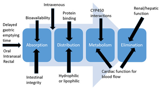 Most clinicians that work with pediatrics have heard the statement “Children are not just small adults”. Further, it is important to remember that neonates are not just small children and premature neonates are not just small neonates. This is important to understand because most of the changes in developmental pharmacology occur in the first year of life, so neonates and infants will be the focus of this section. Developmental pharmacology concepts are broken down into absorption, distribution, metabolism, and elimination (ADME) categories (Figure 1).