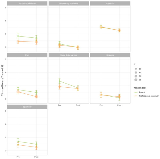 A similar picture can be found when looking at the change in children’s symptoms according to parents and professional caregivers. Significant improvements can only be found in the parents’ ratings of their child’s sleep problems. Even slight improvements in the child’s sleep may subjectively be seen as a significant change by parents, as many studies have shown that the child’s poor sleep constitutes an enormous strain on the parents’ own health [21,22,23]. Professional caregivers may be able to rate the child’s sleep more objectively. This might explain why the ratings of professional caregivers did not vary significantly between the two time points. Generally, treating the complex symptoms experiences by these children constitutes an enormous challenge [16,24], which might explain why significant changes cannot be displayed in such a short period of time. When inspecting the mean of all symptoms, an overall significant improvement can be found for parent and professional caregiver ratings. The tendency of the individual symptom ratings shown in Figure 1 also suggests that overall, all symptoms tend to improve during the care period. Again, the assessment period may just have been too short to observe more significant changes.
