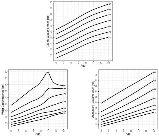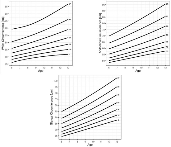 Our study provides WC, AbC, and GC percentile curves and reference values for Czech children aged 6–11 years. These percentiles could be used as a convenient, inexpensive, non-invasive, and quick tool to evaluate the growth status of children. They could be useful in medical practice and public health screening, as well as for an individual assessment of children’s growth. They could be used as a complementary screening tool for general overweight and abdominal obesity as well. Increased fat mass in the abdomen and hips could indicate the presence of metabolic risks and cardiovascular disease in adolescents and adults.
