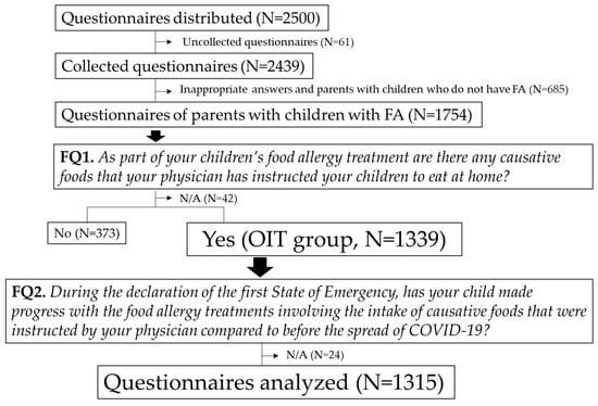 Inclusion criteria of the OIT group is a “Yes” answer to FQ1. The flow chart of the selection of analyzed questionnaires is shown in Figure 1. Exclusion criteria for the final analysis was parents with children who do not have FA, parents with children who do not carry out home-based OIT (FQ1), and parents who did not answer FQ1 and FQ2.