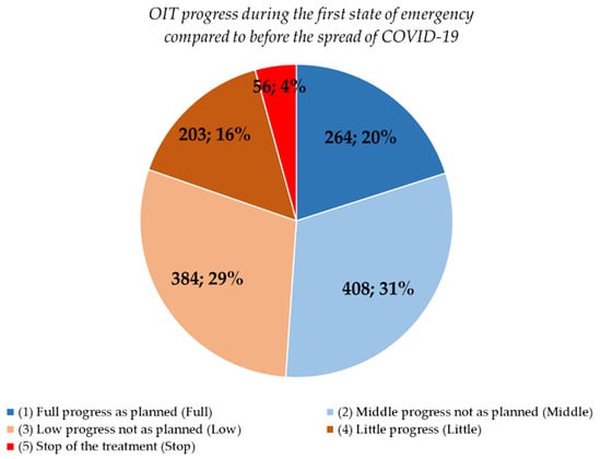 Compared to before the COVID-19 pandemic, the question about the subjective progress of home-based OIT (FQ2) elicited the following responses: “Full” in 264 (20.1%) respondents, “Middle” in 408 (31.0%), “Low” in 384 (29.2%), “Little” in 203 (15.4%), and “Stop” in 56 (4.3%) (Figure 2). The analysis of the free-text descriptive responses of the reasons for “Full” or “Middle” showed that the frequency of the appearance of “at home”, “time”, and “increased” was high, but the reasons for “Low”, “Little”, or “Stop” showed that the frequency of “emergency”, “consultation”, “scary”, and “symptom” was high (data not shown for both).
