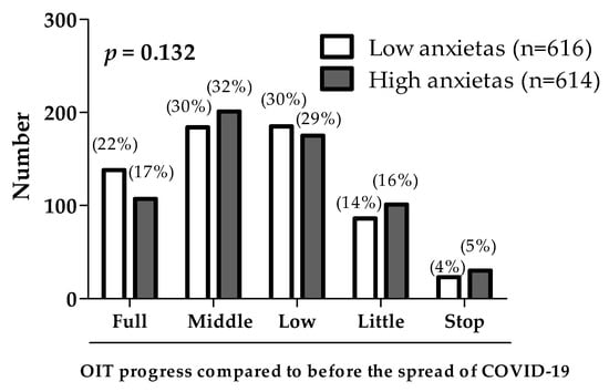 The STAI had 1230 (93.5%) and 85 (6.5%) complete and incomplete answers, respectively. The proportion of respondents with high anxietas comprised approximately half of the study population (49.9%, 614/1230). There was no association between the anxietas groups of parents and the subjective progression of home-based OIT (Figure 3).