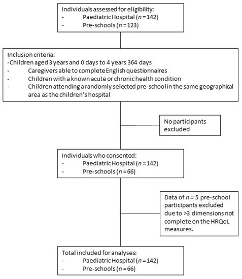 Two-hundred and three children and caregivers, from the hospital and pre-schools, were recruited (Figure 1). All 142 caregivers at the hospital who were approached agreed and consented to participate. Across the three English medium pre-schools included, there were 123 children aged between 3 and 4 years. Research packs were distributed to all 123 children; however, only 66 were returned. Although all caregivers signed consent, data from five children in the healthy group were excluded, as three or more dimensions on the HRQoL measures were not completed. There were no exclusions due to English literacy, or for any other reasons. The data of 203 children were analysed.