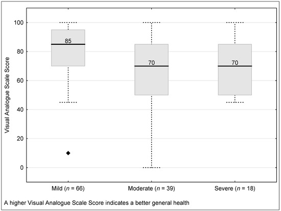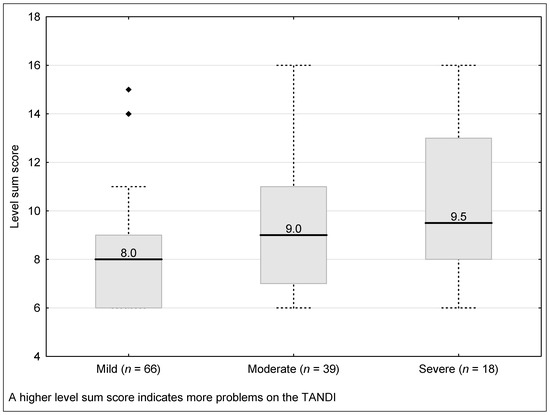 The TANDI VAS score was significantly different between those with a health condition categorised as mild, moderate, or severe (Kruskal–Wallis H = 10.28, p = 0.006). Those classified as mild had a significantly better LSS than those classified as moderate (Kruskal–Wallis H = 1.84, p = 0.002). The median VAS score was higher for those classified as mild compared to severe and tended toward significance (Kruskal–Wallis H = 3.04, p = 0.065). There was, however, no difference between those classified as moderate and those classified as severe (Kruskal–Wallis H = −0.43, p = 0.667) (Figure 3).