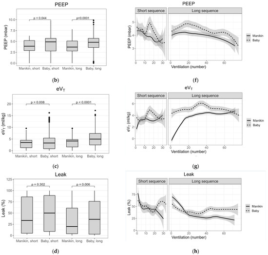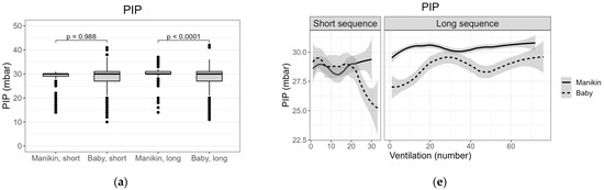 Similar median PIP, corresponding to the set value, was generated in all four groups, consistent with previous clinical [10,20] and simulation studies [25,26]. The higher smoothed-mean in ML compared to BL, reflected in the significant p value of the boxplots, was expected, as PIP was sometimes intentionally increased from 30 to 35 cmH2O in this group to overcome low lung compliance and achieve visual chest rise. The greater variability of delivered PIP in the baby groups, seen in Figure 3a,e, may result from variation in the clinical condition not being replicated in the simulated setting- for example spontaneous movement of the baby, neonatal respiratory efforts [27,28], or continued stimulation.