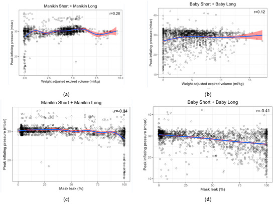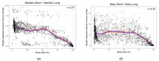 Scatter plots of correlation between (a) Peak inflating pressure (PIP) and expired tidal volume (eVT) for combined Manikin Short + Manikin Long (MS + ML); (b) PIP and eVT for combined Baby Short + Baby Long (BS + BL); (c) PIP and leak for combined MS + ML; (d) PIP and leak for combined BS + BL; (e) leak and eVT for combined MS + ML; (f) leak and eVT for combined BS + BL. Note that Pearson’s r given in the figures differs from those quoted in Table 2 as a result of the combination of manikin and baby groups.