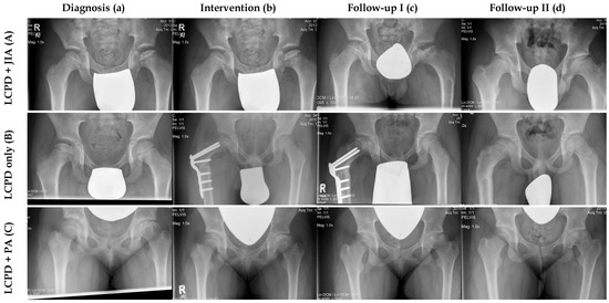 Comparison of three radiological courses between one patient with LCPD only and two patients with concomitant JIA. (A) Male patient (Nr. 6) with LCPD and JIA. (a) LCPD was diagnosed at the age of 8.7 years (Elizabethtown classification: Ib) and JIA was detected one month later. (b) This patient had proximal femoral varus osteotomy (Elizabethtown classification: IIb). (c) Anteroposterior radiograph of the pelvis after implant removal (Elizabethtown classification: IIIa). (d) This patient had a very good clinical and radiological outcome at the last follow-up (FU: 7.9 years, mHHS: 95, Stulberg: II). (B) Male patient with LCPD only (Nr. 9, control group). (a) LCPD was diagnosed at the age of 7.9 years in this patient (Elizabethtown classification: Ib). (b) He underwent proximal femoral varus osteotomy and permanent trochanteric epiphysiodesis (Elizabethtown classification: IIb). (c) Anteroposterior radiograph of the pelvis during the course of disease (Elizabethtown classification: IIIb). (d) This patient had a very good clinical and radiological outcome at the last follow-up (FU: 4.9 years, mHHS: 100, Stulberg: II). (C) Female patient with LCPD and psoriatic arthritis (Nr. 8). (a) LCPD was diagnosed at the age of 11.8 years (Elizabethtown classification: Ib), followed by psoriatic arthritis 2 months later. (b) This patient underwent retrograde drilling of the left femoral head (Elizabethtown classification: IIb). (c) Anteroposterior radiograph of the pelvis during the course of disease (Eliizabethtown classification: IIIb). (d) At the last follow-up the patient had a poor clinical and radiological outcome (FU: 2.8 years, mHHS: 57, Stulberg: V).