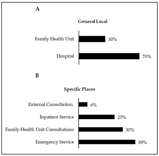 Two hundred and twenty questionnaires were delivered, and 198 responses were obtained, corresponding to a participation rate of 90%. Regarding the general locations of questionnaire administration, 30.3% were administered in Cidade do Lis Family Health Unit, and 69.7% in the Pediatric Emergency Service of Hospital de Santo André (Figure 1A). As for the specific locations of questionnaire administration, 38.9% were administered at the emergency service, 30.3% at consultations in the Cidade do Lis Family Health Unit, 24.7% in the inpatient service, and 6.1% in the external consultation (Figure 1B).