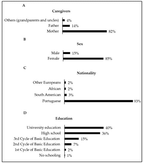 Figure 2 shows that of the 198 questionnaires collected, 96% were answered by parents and 4% by other caregivers (grandparents and uncles). The mean age of the caregivers was 38.5 ± 8.0 years old (range: 19–73 years) and most were female (85%). In addition, 93% of the responders were of Portuguese nationality, 3% of South American origin, 2% from African countries, and 2% from other European nationalities. Regarding the level of education, most completed either University education (40%) or high school (36%), while the rest finished the 3rd cycle of basic education (15%), 2nd cycle of basic education (7%), and 1st cycle of basic education (1.5%). Only one caregiver (0.5%) reported having no level of education. The average age of the children/adolescents was 6.5 ± 5.1 years old (range: 1 month to 17 years old), with 52% female and 48% male.