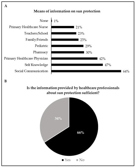 Means of information on sun protection (A); information provided by healthcare professionals (B). In Figure 3A, the sum of the proportions exceeds 100% because multiple-choice answers were allowed.