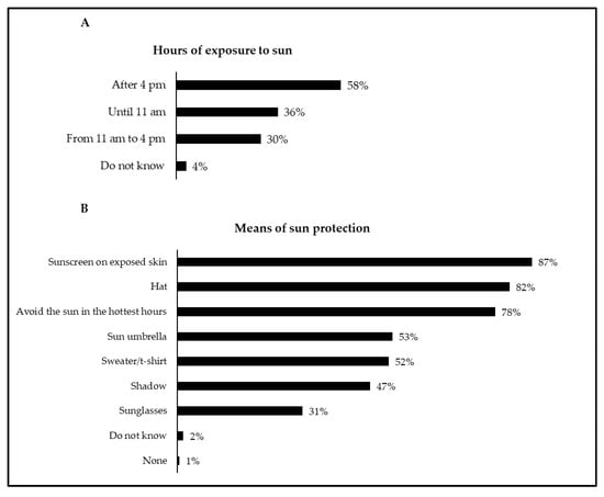 Hours of exposure to the sun (A) and means of sun protection (B) in the child/adolescent. In both figures, the sum of the proportions exceeds 100% because multiple-choice answers were allowed.