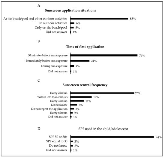 Sunscreen application situations (A), time of first application (B), sunscreen renewal frequency (C), and sun protection factor (SPF) used in the child/adolescent (D).