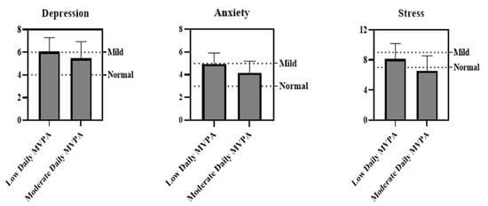 Means of depression, anxiety, and stress across different levels of daily MVPA.