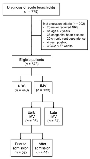 The American Academy of Pediatrics (AAP) recommends supportive care alone and against the routine use of chest radiography, routine laboratory investigations, bronchodilators, hypertonic saline, or systemic steroids in the management of acute bronchiolitis [8]. However, no guidelines exist for the management of critical bronchiolitis requiring admission to the pediatric intensive care unit (PICU), which represents 15–22% of admitted bronchiolitis patients [5,9,10]. Distinguishing factors predictive of higher illness severity include demographic features (low birth weight [11], prematurity [2,7], young age [2,5,7,12]), clinical features at admission (tachypnea [11], retractions [5,12], or desaturation at admission [5]), and comorbidities (chronic lung disease, congenital heart disease, Trisomy 21, or neuromuscular disorders [2,3,7]). However, none of these studies identified risk factors associated specifically with higher likelihood of invasive mechanical ventilation.