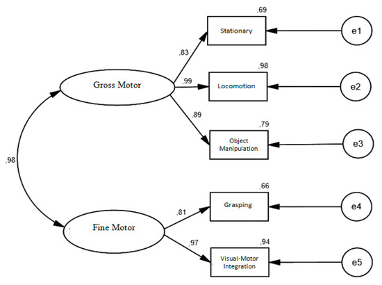 The PDMS-2 factorial model tested for the Portuguese sample was identical to the one originally proposed by the authors (Figure 1); that is, a model of two latent factors, but that in our models these two factors are correlated (gross motor skills and fine motor skills) defined respectively by three (Stationary, Locomotion and Object Manipulation) of gross motor skills and two (Grasping and Visual–Motor Integration) items of fine motor skills. Its adjustment was tested through a confirmatory factor analysis.