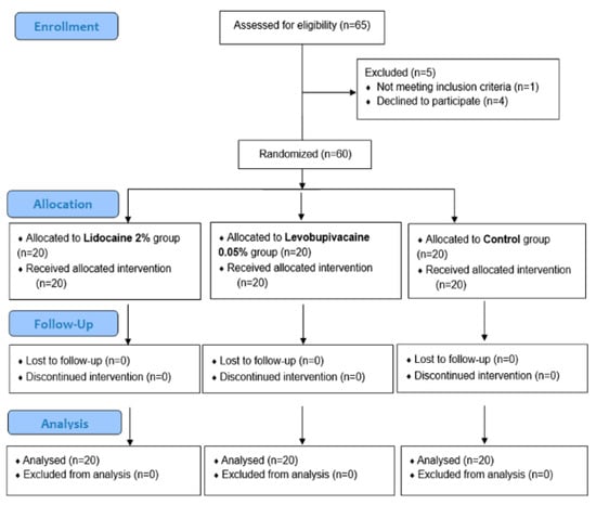 A total of 60 patients were randomly assigned to the study. Depending on intraoperatively administrated local analgesic, the patients were divided into three study groups (20 patients per group). In the first group of the patients, the total amount of 6 mL of 2% lidocaine (Lidokain®, Belupo, Koprivnica, Croatia) was injected at the three trocar insertion sites (2 mL at each) prior to incision, and 10 mL of 2% lidocaine was injected at the end of the procedure, under the direct visualization of the laparoscope, below and around the defect of the peritoneum at the site of varicocele. In the second group of the patients’ total amount of 6 mL of 0.5% levobupivacaine (Chirocaine®, Abbott Scandinavia AB, Solna, Sweden) was injected at the three trocar insertion sites (2 mL at each) prior to incision and 10 mL of 0.5% levobupivacaine was injected at the end of the procedure, under the direct visualization of the laparoscope, below and around the defect of the peritoneum at the site of varicocele. The third group was the control group; there was no local or peritoneal administration of any local anesthetic prior, during, and after the surgical procedure. The Visual Analogue Scale (VAS) was used to measure pain intensity [13]. The VAS (0–10 scale) pain score was measured by a blinded nurse at four different time points (2, 6, 12 and 24 h after the surgery). The study protocol envisaged collection of the following data: demographic data (age, weight, height, and body mass index), characteristics of varicocele (lateralization, diameter of veins, and indication for surgery), intraoperative data (intraoperative finding, duration of surgery, and intraoperative complications) and postoperative follow-up (length of hospital stay, postoperative complications, VAS score at 2, 6, 12 and 24 h after surgery, and usage of analgesics). The flow chart diagram of the study is shown in Figure 1.