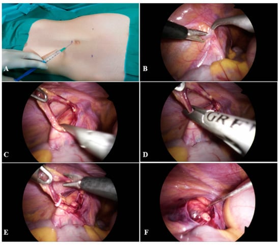 A 2 mL of local anesthetic was injected subcutaneously in the supraumbilical region. After 30 s supraumbilical skin incision, 5 mm in length, was performed. Through the supraumbilical incision, a Veress needle was introduced, and CO2 pneumoperitoneum was established. After achieving the pneumoperitoneum, first 5 mm trocar was introduced through the same incision. Then, a local anesthetic was injected subcutaneously in both midclavicular lines, 10–20 mm below the horizontal line to the umbilicus, along the lateral border of each abdominal rectus muscle. After 30 s, two 5 mm incisions were performed at the site of the previous injection of local anesthetic, and two additional 5 mm trocars were inserted (Figure 2A). The abdominal cavity was inspected using a 5 mm laparoscope (Olympus, Tokyo, Japan). After the spermatic vessels and vas deferens were identified, the peritoneum was opened 1–2 cm superior to the internal inguinal ring to expose the spermatic blood vessels (Figure 2B,C). After mobilization of the vessels, nonabsorbable polymeric ligating clips (Ligating Clips ML; Grena, Brentford, UK) were placed on the spermatic blood vessels, and the blood vessels were resected between the two clips (Figure 2D–E). At the end of the procedure, a local anesthetic was applied below and around the site of the peritoneal defect (Figure 2F). After controlling hemostasis, CO2 was eliminated from the abdominal cavity, trocars were removed, and skin incisions were sutured with nonabsorbable sutures (Surgipro™ II, polypropylene 3/0, Covidien, Dublin, Ireland).
