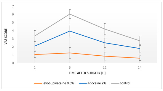 Namely, in patients in whom 0.5% levobupivacaine has been used, significantly lower VAS pain scores were recorded at each time point assessed, in comparison with the patients who received 2% lidocaine, or the patients from the control group in whom no local anesthetic was applied (p < 0.001) (Figure 3).