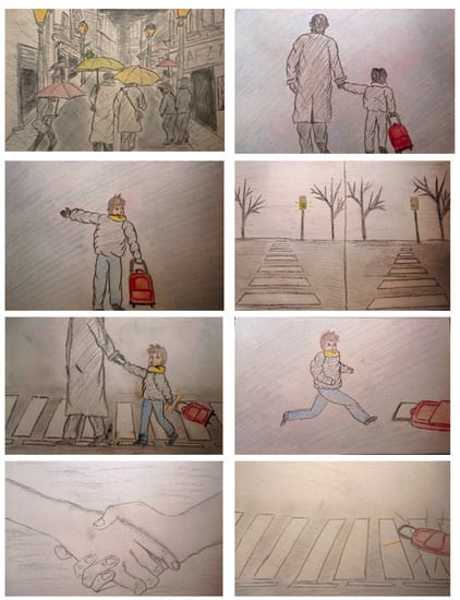 The materials used for the intervention were 27 pictures which were designed by one of the researchers. Each drawing represented roughly one of the events of story. These pictures were used in the session interventions as visual support to facilitate comprehension of the story and to encourage narrative. Figure 1 shows the pictures used as visual support to narrate the first four events of Scene 1.