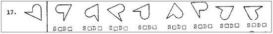 Students’ spatial ability was evaluated through the card rotations test (CRT) [45]. CRT is a true–false test including two parts of 10 questions; it was developed to evaluate an individual’s ability to see similarities and differences between the shapes. One point is given to each true answer, and the total scores could range from 0 to 160. Figure 2 shows one of the CRT items.