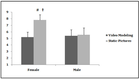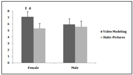 The game performance scores recorded for female and male students as a function of experimental conditions. # Significant difference between conditions for female students. † Significant difference between female and male students in the video modeling condition.