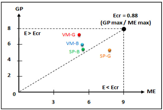 Learning efficiency per experimental condition for high-content complexity, based on mental effort and comprehension performance. The diagram is a representation modeled after Kalyuga and Sweller [48], where VM-G = video modeling girls, VM-B = video modeling boys, SP-G = static pictures girls, SP-B = static pictures boys, GP = game performance, ME = mental effort, E = efficiency, Ecr = critical efficiency.