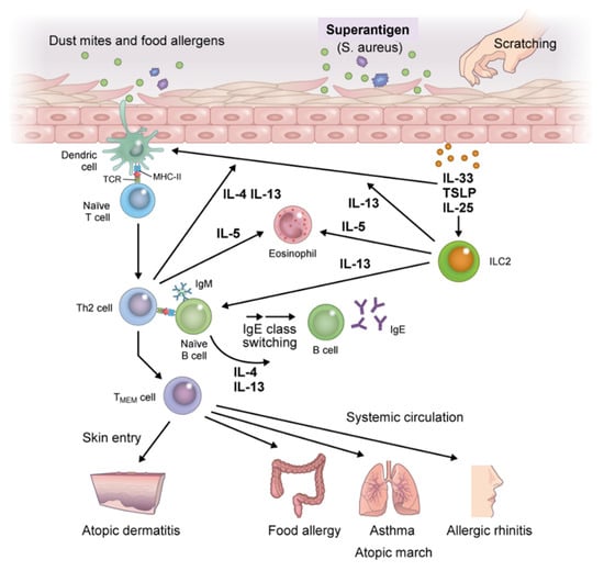 Immunologic mechanisms underlying atopic march. Exposure of skin with impaired barrier function to food allergens, dust mites, or mechanical damage leads to the release of epithelial cell-derived thymic stromal lymphopoietin (TSLP), interleukin (IL)-25, and IL-33, which induce the activation of immature dendritic cells (DCs) and group 2 innate lymphoid cells (ILC2s). DCs that capture allergens migrate to draining lymph nodes, process allergens, and present them to naïve T cells which promote the generation of allergen-specific Th2 cells. Th2 cells produce high levels of IL-4 and IL-13 after clonal differentiation and expansion and induce B cell isotype switching to specific IgE cells, thereby enhancing the production of allergen-specific IgE and IgE memory B cells. Allergen-specific IgE binds to the surface of effector cells (i.e., mast cells and basophils) via the high-affinity IgE receptor (FcεRI). ILC2 activation further accelerates antigen-nonspecific Th2 immune skewing; memory pools of allergen-specific Th2 and B cells are also generated during this phase. Memory allergen-specific Th2 cells circulate and infiltrate the skin, provoking exacerbation of AD, and entering the systemic circulation where they spread to remote organs. Then, upon re-exposure to allergens in individuals previously sensitized to the same allergens, diverse atopic disorders are initiated, resulting in atopic march. Abbreviation: TMEM, memory allergen-specific T helper 2.