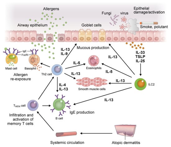 Meanwhile, innate lymphoid cells (ILCs), particularly ILC2, are lymphocytes with helper activities that are involved in innate immunity. In contrast to Th cells, which require several days for differentiation, ILCs reside as mature lymphocytes in steady-state tissue and are rapidly and antigen-nonspecifically activated by EC-derived TSLP, IL-25, and IL-33 to induce type 2 immune responses, including IL-5 and IL-13 responses. ILC2 serves as the initiation point for the onset of allergic diseases, and has also recently been shown to induce Th2 cell differentiation. Thus, ILC2 is involved not only in the development of allergic diseases, but also in disease exacerbation and chronicity [34,35,36].