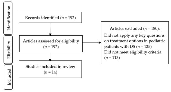 The eligibility criteria for including studies in the present review were as follows: (a) studies that included children and adolescents with DS, aged 0–19 years; (b) original research with a prospective or retrospective cohort, cross-sectional, longitudinal, case–control, or randomized controlled trial design administered in the hospital, outpatient clinic, community setting, or school; (c) studies that looked into treatment strategies such as adenotonsillectomy, lingual tonsillectomy, positive airway pressure therapy, high-flow nasal cannula, pharmacologic therapy, myofunctional therapy, hypoglossal nerve stimulation, drug-induced sleep endoscopy, or weight loss/weight reduction. We did not exclude studies that targeted children with DS who also had other medical conditions or comorbidities such as obesity, hypothyroidism, cardiovascular disease, or diabetes. We did not exclude studies based on sample size. Articles that were excluded were case reports, meta-analyses, reviews, and non-English language studies. The search identified 192 results. Exclusion of studies occurred in two phases: (1) records that did not apply any key questions on treatment options in pediatric patients with DS (n = 125) and (2) articles that did not meet eligibility criteria (n = 113). After eligibility screening, 14 studies were included. Figure 1 illustrates the study selection process for this present review.