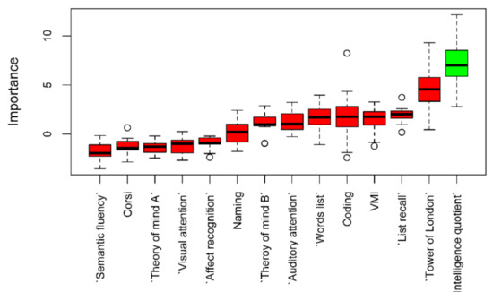 Boruta feature selection results. Green bar is IQ, the variable confirmed as important to distinguish the two groups of patients. Red bars represent the other variables included in the model but not confirmed as important. Dots in the upper or lower parts of the boxplots are outliers defined according to Tukey.