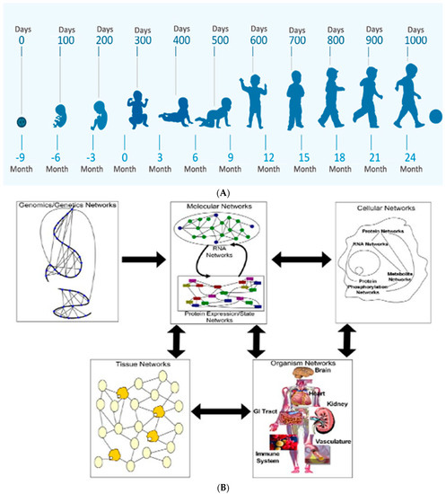 The horizontal/vertical diagnostic process across maturing phenotypes during the first 1000 days: (A) This horizontal perspective over the first 1000 days starts at conception through two years of age from embryo to the young child, as depicted by this WHO figure. (B) The flow of information across biological systems through a hierarchy of networks depicts the vertical diagnostic process. Successive panels highlight the interactions between different networks that comprise a biological system. Genomic networks depict interactions between DNA sequences which may result in a longer range, as well as more short-term changes, that alter chromosome structures to modulate gene activity These interactions also promote synergistic effects on higher-order phenotypes. Genomics networks in turn subserve molecular networks comprised of RNA, protein, metabolites, and other molecules within the system. Molecular networks are components within cellular networks in which complex interactions between these networks result in the complex phenotypes that define living systems. Tissue networks comprise cellular networks which are influenced by molecular and genomics networks. Organism networks then comprise tissue networks that define the component cellular and molecular networks. Disease states are complex phenotypes that emerge from this complex web of interacting networks, given disrupted genetic and environmental interactions to the living system (Sieberts 2007).
