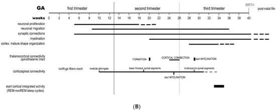 (A). Developmental brain processes begin during gestational age (GA) in weeks 2–3 with the formation of the neural tube. At GA week 4, the rostral segment of the neural tube forms the prosencephalic, mesencephalic and romboencephalic vesicles. The prosencephalic vesicle then forms two vesicles that later become the telencephalon and the diencephalon (thalamus, hypothalamus, and other structures). Telencephalic development is depicted in the schematic diagram published by Borsani et al., 2011. [21] Initially, the telencephalic primordium is comprised of proliferating and differentiating neuroepithelial cells (also termed neural stem cells), characterized by interkinetic nuclear migration to form the ventricular zone (VZ). Radial glial cells are particularly prominent and distinctive and undergo early exponential proliferation. Increasing numbers of progenitor/intermediate progenitor cells contribute to the thickness of VZ by week 4. Progenitor neurons include interneurons, which form early and migrate to the marginal (MZ) and intermediate zones (IZ). The MZ eventually forms cortical layer I before the cortical plate (CP) formation as an early MZ (eMZ). A cell-sparse IZ compartment exists before the CP. Radial glial cells and intermediate progenitor cells can be classified into two distinct subpopulations: apical neurons in the VZ with bipolar fibers, and basal types, which delaminate from VZ with unipolar basal fibers. Apical progenitor cells in the VZ and basal progenitor cells in the subventricular zone (SVZ) are considered to be the main source of pyramidal neurons. Around GA week 5, neurogenesis begins at week 5 with neuronal precursors proliferating rapidly within the VZ. The neurons within the first recognizable cortical layer, known as the pre-plate (PP), form the earliest synaptic connections. PP is a transient structure present before the appearance of the CP. Around week 7, the PP cells contribute to the subplate (SP), which remains below the CP after its formation and contains post-migratory pyramidal neurons and interneurons. Accumulation of basal progenitor cells create a distinct new compartment above the VZ, termed the SVZ, where intermediate progenitor cells proliferate. By GA week 8, radially migrating neurons from VZ and SVZ initiate the development of the layered CP forming from inside to outside. Pyramidal neurons eventually migrate outward along the radial glial cells [21]. These neuroembryonic changes influence subsequent brain development during the later trimesters (B). This timeline depicts neurobiological telecephalic processes with sensory/motor connectivities during human brain maturation. Successive weeks with increasing gestational age (GA) relate to the major events during fetal neural development: neuronal proliferation; neural migration; synaptic connections; myelination; cortex (mature shape organization); thalamocortical connectivity (spinothalamic tract); cortico-spinal connectivity; with the early expression of cortically-integrated activities such as REM-non-REM sleep cycles [21].