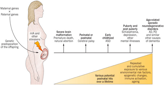 Proposed interrelated factors associated with maternal immune activation in humans, expressed as a spectrum of neurologic/behavioral disorders expressed by the child, juvenile, adult or elderly individuals. Abbreviations: AD, Alzheimer’s disease; ASD, autism spectrum disorder; MIA, maternal immune activation; PD, Parkinson’s disease [36].