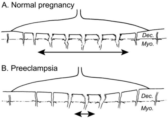 (A) Normal placental bed with full transformation of the myometrial spiral arteries with widened vascular diameters except at the periphery of the placental bed. (B) Defective deep placentation is characterized by non-transformation of the myometrial spiral arteries, reducing placental blood flow within the central area with a paucity of deep placentation [42].