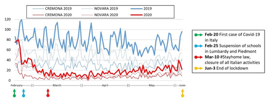 On 9 March 2020 (effective starting the following day), the whole of Italy received the “#stayhome” (#iostoacasa) executive order from the Italian Government [2]. This order was set to remain in place until after Easter, with all public gatherings banned and travel only allowed for “urgent, verifiable work situations and emergencies or health reasons”. However, due to the continuing severe situation, the order deadline was postponed to 4 May 2020. After that, work activities slowly returned to normal, albeit with some restrictions until 3 June 2020, when all activities returned normal including movement within regions and, on 14 June 2020, between regions.