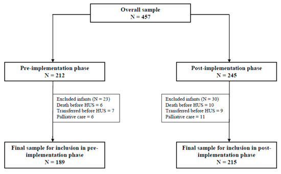 Of the 457 eligible infants over the 2 time periods, a total of 404 infants were included in the study, 189 infants in the pre-implementation phase and 215 infants in the post-implementation phase (Figure 1).