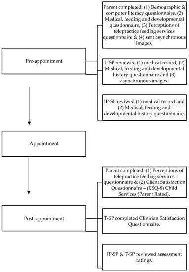 - Raatz, M.; Ward, E.C.; Marshall, J.; Burns, C.L. Developing the system architecture for conducting synchronous paediatric feeding assessments via telepractice. J. Telemed. Telecare 2019, 25, 522–558. [Google Scholar] [CrossRef] [PubMed]