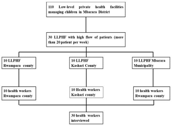 Key informants with rich experience pertinent to the study topic were selected using purposive sampling. They included healthcare providers from 30 purposively selected LLPHFs that offered child health services, received at least 20 patients per week and had been in operation for at least 2 years, as shown in Figure 1. The healthcare providers were identified with the help of the facility heads and were included if:
