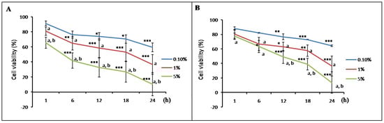 Cell viability of human lung cells, including (A) A549: alveolar epithelial cells and (B) HEL299: human embryonic lung tissue cells, exposed to 0.1%, 1%, and 5% human meconium concentrations for 1, 6, 12, 18, and 24 h (nExp = 5). The data represent the mean ± standard deviation. a: p < 0.05, versus the 0.1% group; b: p < 0.05 versus the 1% group; *: p < 0.05 versus at 1 h; **: p < 0.005 versus 1 h; ***: p < 0.0005 versus 1 h.