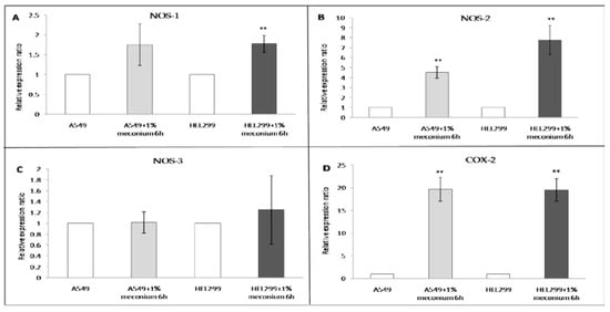 A significant amount of cell death was observed when A549 (Figure 1A) or HEL299 cells (Figure 1B) were exposed to meconium at concentrations higher than 0.1% with an exposure time equal to or longer than 6 h. To investigate the effects of meconium exposure on lung cell gene expression, a pilot RNA-seq study was performed using RNA samples from A549 and HEL299 cells following a 6 h exposure to 1% meconium. Meconium may activate inflammatory cells and induce cytokines to initiate pulmonary inflammation [24], and NOS and COX, which are the primary inflammatory mediators and are expressed in the airway epithelium, releasing NO and COX products during acute inflammatory responses [65]. The results of the RNA-seq showed greater fold changes in nitrite production-related genes, including NOS-1, and NOS-2, especially NOS-2, in the HEL299 cells than in A549 cells. The COX-2 expression levels in both A549 and HEL299 cells were very high (Table 3). These genes were selected for further study, and their expression was validated by real-time RT-PCR. NOS-1, NOS-2, NOS-3, and COX-2 expression was detectable in both A549 and HEL299 cells. Significant differences in NOS-1 mRNA expression levels were observed between the HEL299 cells with meconium stimulation versus those without (Figure 2A). However, no significant differences in NOS-1 mRNA expression levels were observed in A549 cells with or without meconium stimulation (Figure 2A). NOS-2 (Figure 2B) and COX-2 (Figure 2D) mRNA levels increased significantly following meconium stimulation in both in A549 cells and HEL299 cells. No significant differences were observed for NOS-3 mRNA levels in A549 and HEL299 cells with and without meconium stimulation (Figure 2C).