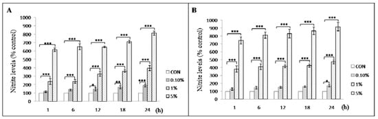 Effects of meconium concentrations on nitrite production in (A) A549 and (B) HEL299 cells. A549 and HEL299 cells were exposed for 1, 6, 12, 18, or 24 h to 0.1%, 1%, or 5% human meconium. (nExp = 4). The data represent the mean ± standard deviation. Nitrite levels were significantly higher in the supernatants of cells exposed to meconium compared with the values in control cells. *: p < 0.05; **: p < 0.005; ***: p < 0.0005.