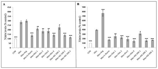 L-NAME, dexamethasone and NS-398 significantly reduced nitrite production following 1% meconium exposure for 6 h in (A) A549 and (B) HEL299 cells (nExp = 4). Nitrite levels were significantly higher in the supernatant of untreated cells exposed to meconium compared with those in control cells. The data represent the mean ± standard deviation. Mec: 1% meconium exposure for 6 h. Arg: 2 mM L-arginine; L-NAME: 2 mM L-Nω-nitro-arginine methylester; Dec 1: 10−10 M dexamethasone; Dec 2: 10−8 M dexamethasone; Dec 3: 10−6 M dexamethasone; Dec 4: 10−4 M dexamethasone; NS-398-1: 25 µM NS-398; NS-398-2: 50 µM NS-398; NS-398-3: 100 µM NS-398. *: p < 0.05; **:p < 0.005; ***: p < 0.0005.