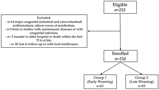 We enrolled all newborns with gestational age < 32 weeks or body birth weight < 1500 g, consecutively admitted in Neonatal Intensive Care Unit (NICU) of Policlinico Umberto I, Sapienza University of Rome, from January 2015 to December 2019 and with a follow-up of 12 months. We excluded subjects with major congenital (intestinal and extra-intestinal) malformations, inborn errors of metabolism, born to mother with autoimmune diseases, congenital infection, transfer to other hospital or death within the first 72 h of life, or with incomplete clinical data, lost to follow-up, or that developed food intolerance in the first 12 months [14,15,16,17,18,19,20].