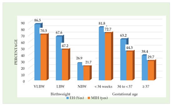 Presence of enamel hypomineralization (EH) and molar incisor hypomineralization (MIH) according to birthweight and gestational age.