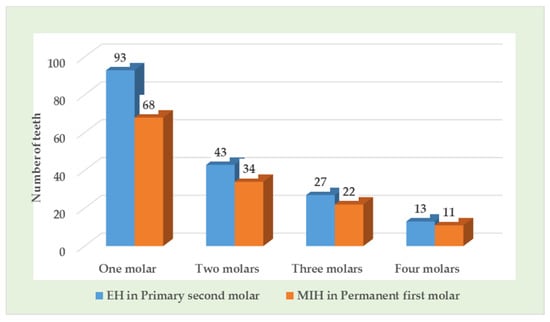 Number of primary second molars and permanent first molars affected per child with enamel hypomineralization (EH) and MIH.