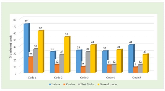 Table 5 and Figure 4 show the MIH category in permanent molars and incisors. Demarcated opacity was the most common type of MIH and maxillary molars were the most frequently affected teeth, followed by maxillary incisors, mandibular molars, and mandibular incisors.