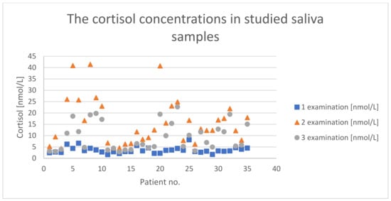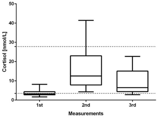 The cortisol concentration in children after the intervention increased from 1.5–1.6 (2 patients) to 18.8 (1 patient) times compared to that in the first measurement; the mean cortisol level was 12.5 nmol/L. After 20 min, a significant decrease in the concentration of the hormone was observed in relation to the second measurement with the average value of 9.5 nmol/l. The decrease in concentration in the third measurement compared to the second measurement ranged from 1.01 to 3.4 (Figure 3).