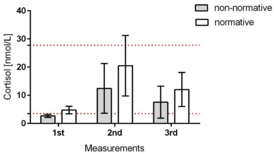 The norms for the minimum and maximum cortisol levels in children in the studied age were determined based on literature data [,].