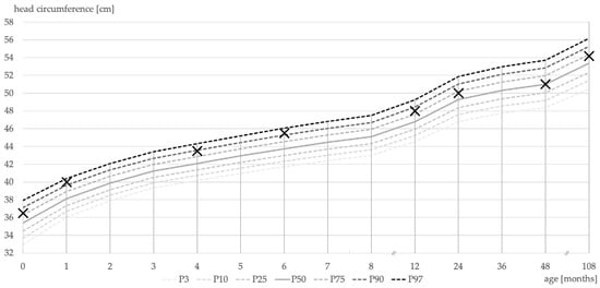 Percentile curves (P3–P97) of head circumference as a measure of dispersion. Crosses mark the patient’s measured head circumference during routine examinations. Patient’s head circumference was above the 50th percentile during his first 9 years of life.