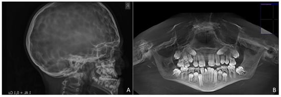 Extraorally, the typical Crouzon syndrome features of brachycephalus, exophthalmos, and hypertelorism were notable. In profile view, the underdevelopment of the midface with absent zygomatic prominence was evident (Figure 3). Intraorally, an early mixed dentition with pronounced crowding and complete loss of space for the upper permanent canines was observed. The maxilla appeared narrow with a high palatal vault without a cleft palate (Figure 3). The extreme mesial–basal jaw relationship came with a WITS appraisal of −18.9 mm, an extremely retrognathic maxilla, and a minor retrognathic mandible (Figure 2A). The need for treatment was manifested intraorally by a more than a full-step class III malocclusion. The patient showed an anterior and left-sided crossbite, and a tendency towards an open bite (Figure 3). Radiographically, impaction of the maxillary canines was evident (Figure 2B).